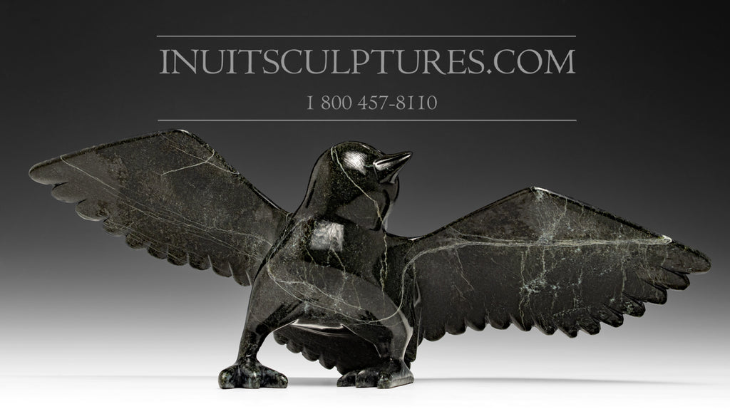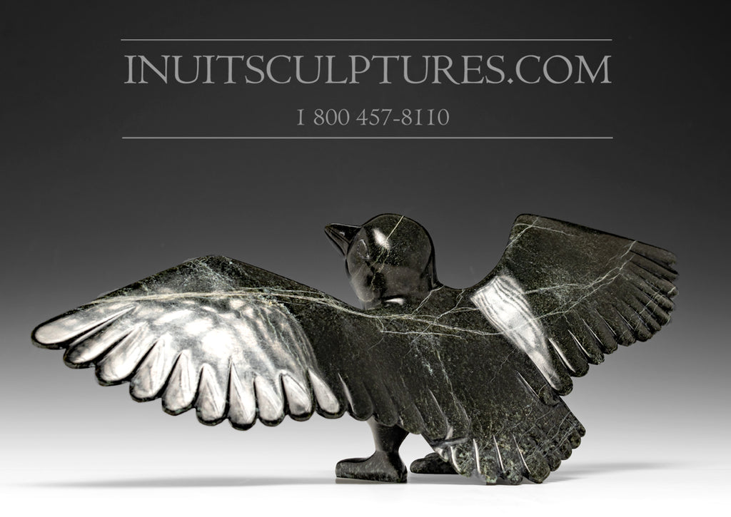 Cet oiseau est parfait ; de la pierre sombre et intense au battement surprenant des ailes. Les yeux incrustés sont larges et perçants. L'observateur ne peut pas savoir avec certitude si ce noble oiseau vient d'atterrir ou s'il est alarmé et se prépare à prendre son envol.
